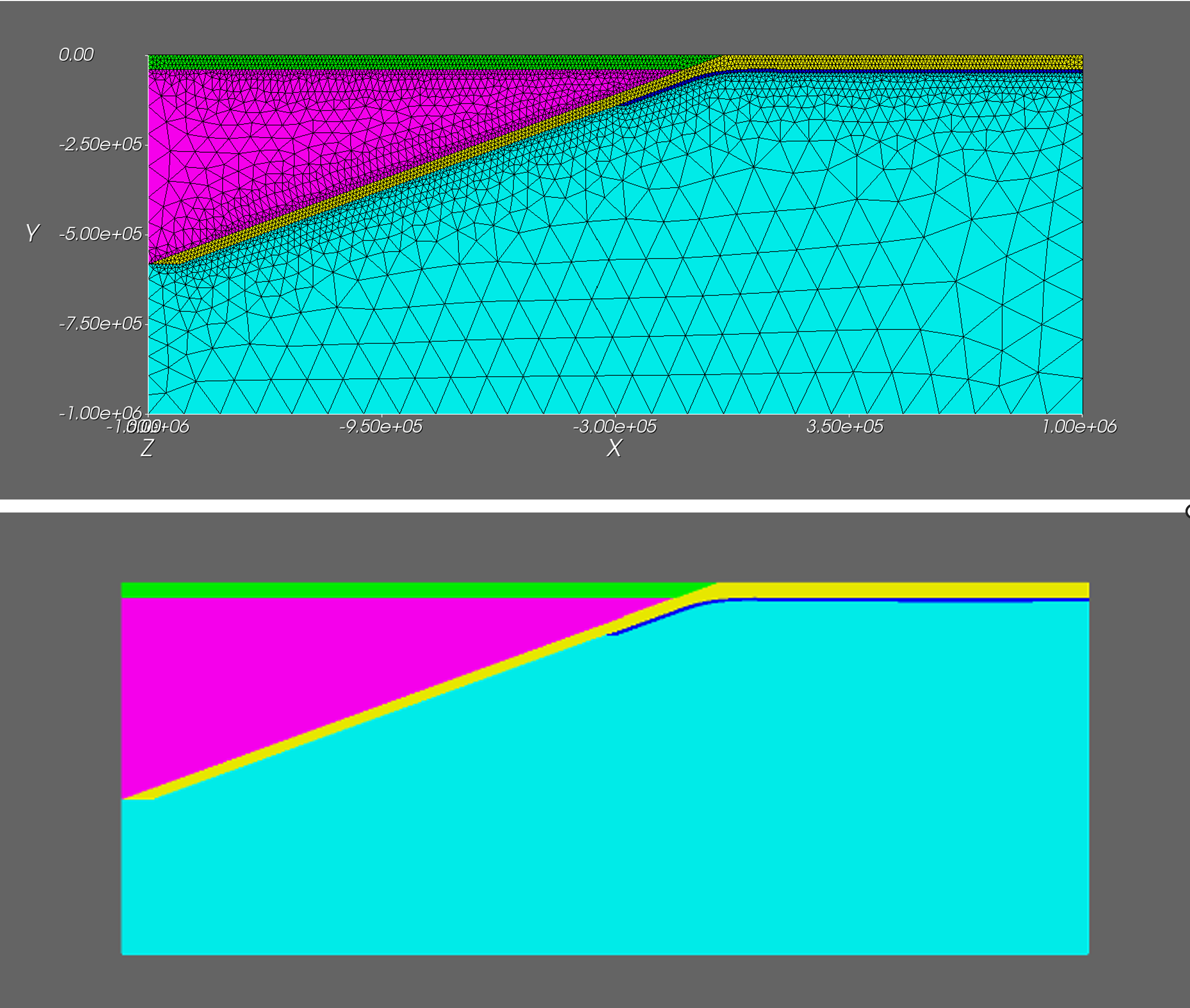 Figure 1. Two‑dimensional subduction‑zone model used for parameter studies. Coreform Cubit scripting enables rapid modification of geometric parameters such as slab dip and layer thickness.